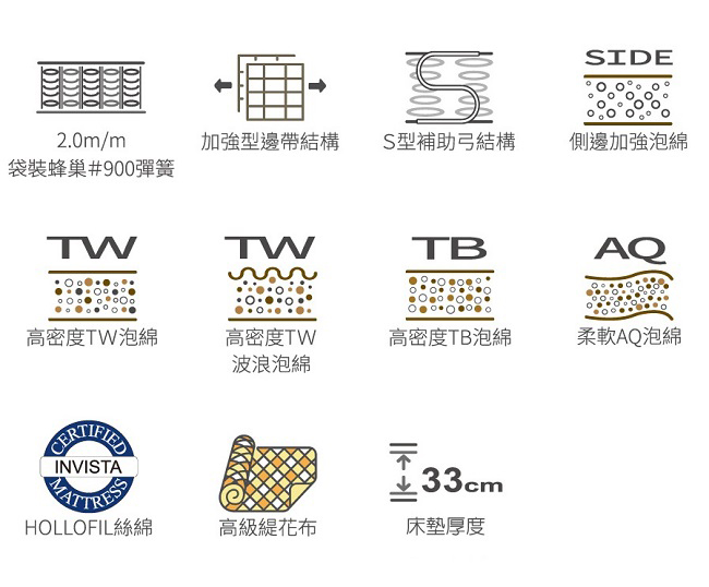 以蜂巢式排列獨立筒袋裝彈簧,彈簧互不干擾、個別支撐人體重量的特性,更緊實支撐身體的每個部位。採用高級緹花布、華麗車花風格及INVISTA™專利HOLLOFIL®絲綿,細膩打造的四線外觀;柔軟、透氣、貼身舒適,是極致尊貴獨立筒床墊的最佳選擇。