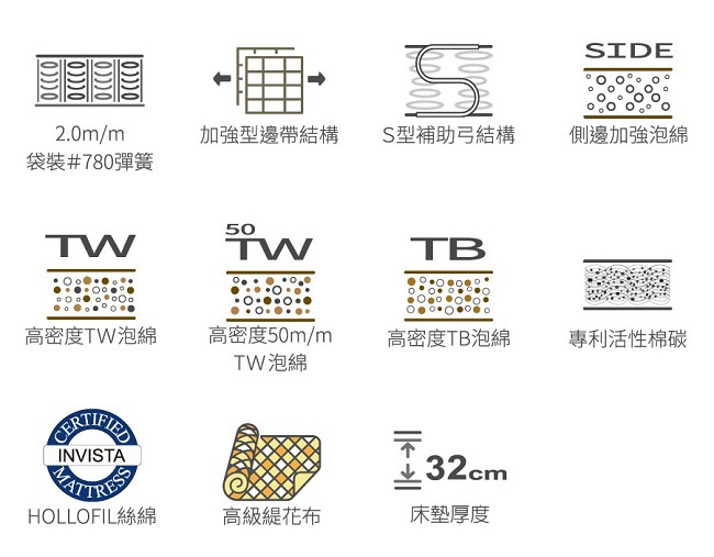 獨家採用每平方公尺含有360公克活性碳的活性碳綿,能使睡眠產生的二氧化碳快速轉換成新鮮空氣。彈簧採獨立袋裝設計,依人體各部位重量獨立支撐,承受力均衡,並使脊椎能得到妥善保護。