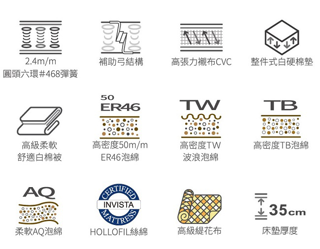 紫羅蘭系列,使用符合人體工學設計專利Spuhl新型2.4m/m六環彈簧,表層使用單層船形舒適襯墊,內含高回彈泡綿、高密度波浪泡綿及INVISTA™專利HOLLOFIL®高彈性絲綿,搭配高級緹花布,軟中帶Q的多層次感受,讓您輕鬆擁有一夜好眠。